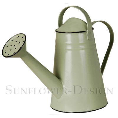 Gießkanne aus Metall mit lindgrünem Emaillelacküberzug. Die unregelmäßige Farbgebung ist richtig schön nostalgisch, um 20 Euro