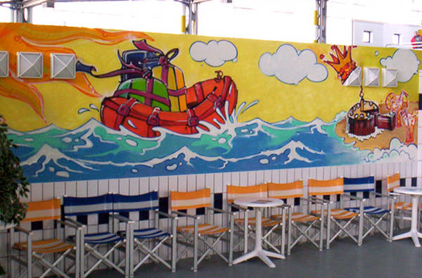 Grundsätzlich ist jedes Motiv möglich, hier richten sich die Brüder nach den Wünschen ihrer Kunden. Die Ausführung ist jedoch immer gleich: perfekt bis in das kleinste Detail. Nach Beurteilung und entsprechender Vorbearbeitung des Untergrundes entstehen die überaus charmanten Wandbilder, die über viele Jahre ihre Brillanz behalten. Ein Beispiel: Die Gestaltung im Düsseldorfer Hallenbad "Düsselstrand" ist nach fünf Jahren wie neu.