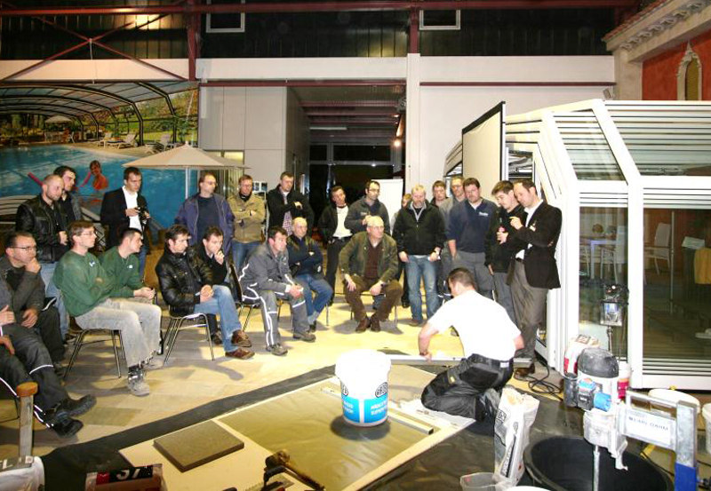 Hauptthema war die feste und frostsichere Verlegung von Natursteinen im Außenbereich, insbesondere bei Schwimmbad- und Terrassenanwendungen. Im Focus der Veranstaltung standen Verlegungstechniken mit einer darunterliegenden Betonplatte, da diese für Schwimmbadüberdachungen aller Art für deren Windsicherung unbedingt erforderlich sind.