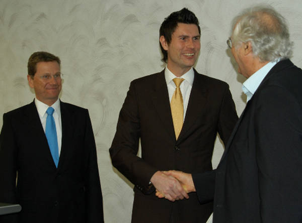 Laudator Dr. Guido Westerwelle, Martin Polcyn, Produktmanager der A.F. Dornbracht GmbH & Co. KG und Prof. Rido Busse, Initiator des Plagiarius, bei der Übergabe der Urkunde (v.l.n.r.)