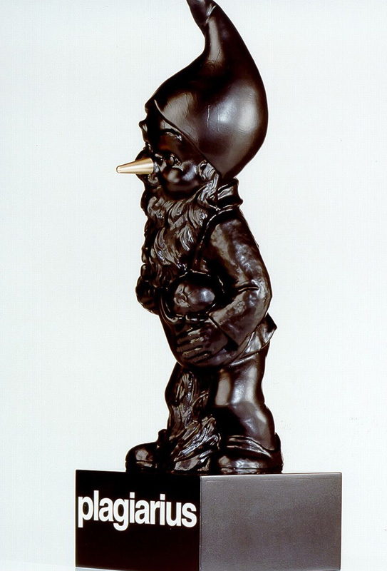 Der handelsübliche Gartenzwerges Nr. 917 der Firma Heissner symbolisiert schwarz lackiert und mit goldener Nase versehen die enormen Gewinne durch Ideenklau (Foto Plagiarius)