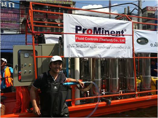Die Wasseraufsichtsbehörde unterstützte die Aktion von ProMinent und stellte rund 1.000 Kunststoffbehälter bereit, die mit dem aufbereiteten Trinkwasser gefüllt werden konnten. Ein rund 10 köpfiges Jet Ski Team verteilte das reine Wasser zu den verstreut liegenden überfluteten Häusern. Ebenso erhielt das thailändische Tochterunternehmen der ProMinent Firmengruppe Unterstützung von der königlichen thailändischen Armee und Navy. Da die Versorgung der Flutopfer von Kanallandestegs durchgeführt wurde, übernahmen die Truppen die jeweiligen Transporte des Bootes zu den Kanälen, die auf dem Wasserweg nicht erreicht werden konnten. Per LKW wurde es zu den verschiedenen Anlagestellen befördert. Zusätzliche Hilfe  für das ProMinent Team kam von den Fernsehsendern Kanal 3,7,9 und 11.