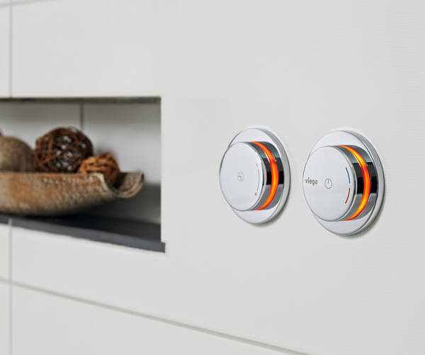 - Die Multiplex Trio E2 von Viega: Die aktuellen Temperaturwerte des einlaufenden Wassers zeigen die Leuchtringe in Farbe bzw. Intensität an